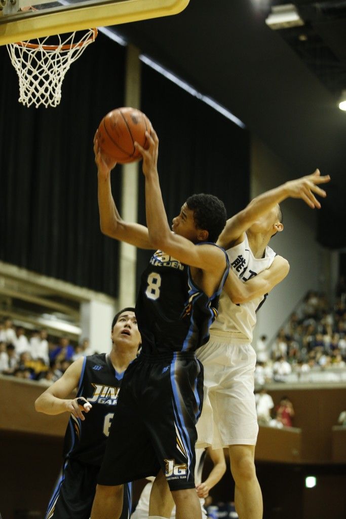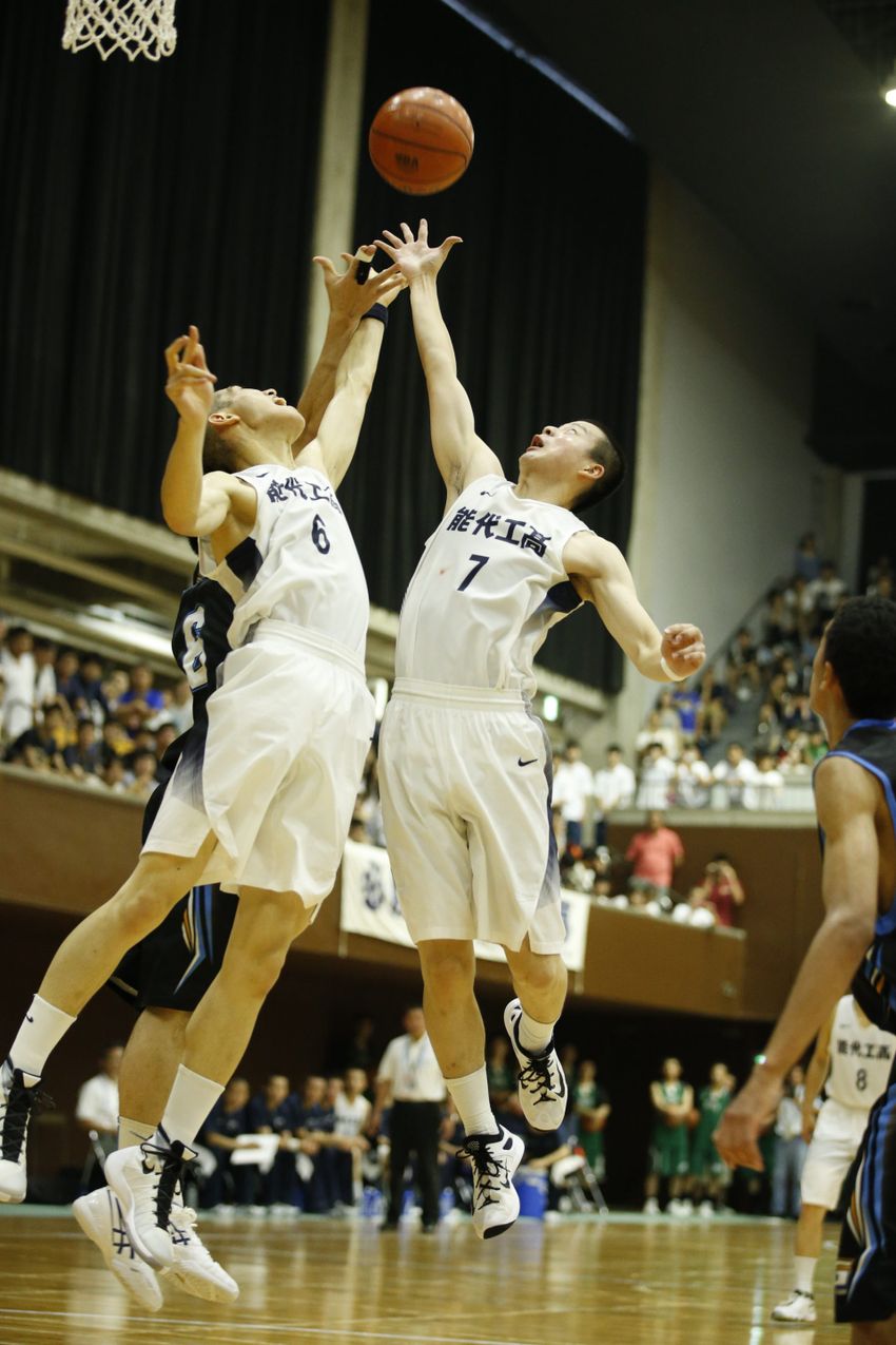 (やっぱり能代工は泥臭い!⑥斉藤大輔と⑦小室望海) ともに選手は丸坊主、ディフェンスとルーズボールを信条とし、アメリカに縁のある“ユウタ”を輩出(能代工は田臥勇太【リンク栃木】、尽誠学園は渡邊雄太【ジョージ・ワシントン大】)。 共通点が多い両校の対決を、「泥臭い高校生日本一決定戦」と勝手に命名! 予想どおり、序盤から熱苦しい?ディフェンスゲームになった。ルーズボールに飛び込むたびに汗で濡れる床、体のぶつかり合いがすさまじいリバウンドを争い…。 結果的に最後まで走り抜き、96点を積み上げた能代工が勝利したが、やはりディフェンスとルーズボールから主導権を握った。 ゾーンディフェンスを敷いたため、オフェンスリバウンドこそ尽誠学園に与えてしまったが、能代工で最も泥臭い男・⑥斉藤大輔が鬼のような形相でオフェンスリバウンドを奪取。加えて長い手足を生かし、④盛實海翔がこちらはさらりとリバウンドを奪っていった。 ディフェンスでも⑦小室望海、盛實がルーズボールを最後まで追い続け、チャンスを次々と生み出したことが勝因に。 「気持ちで負けたら能代工ではないと思います。そこは負けないようにリバウンド・ルーズボールに集中しました」と盛實。必勝不敗を掲げるチームは、昨年のウインターカップから徐々に“らしさ”が見られるようになってきた。 一方の尽誠学園も、ローテーションの早いディフェンスで対抗したが、「1対1の能力が高かったです」と⑤小谷健太が言うように、能代工のエース・小室のドライブを止められず、ディフェンスから流れを作ることができなかった。