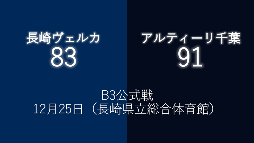 B3新規参入ながらリーグ最高成績を競っている2チーム、長崎ヴェルカ(以下長崎)とアルティーリ千葉(以下A千葉)が、12月25日に初めて直接対決の機会を迎え、アウェイのA千葉が91-83で勝利。両チーム19勝2敗ながら直接の対戦成績結果により、この試合を終えた段階でA千葉がリーグ首位に立った。