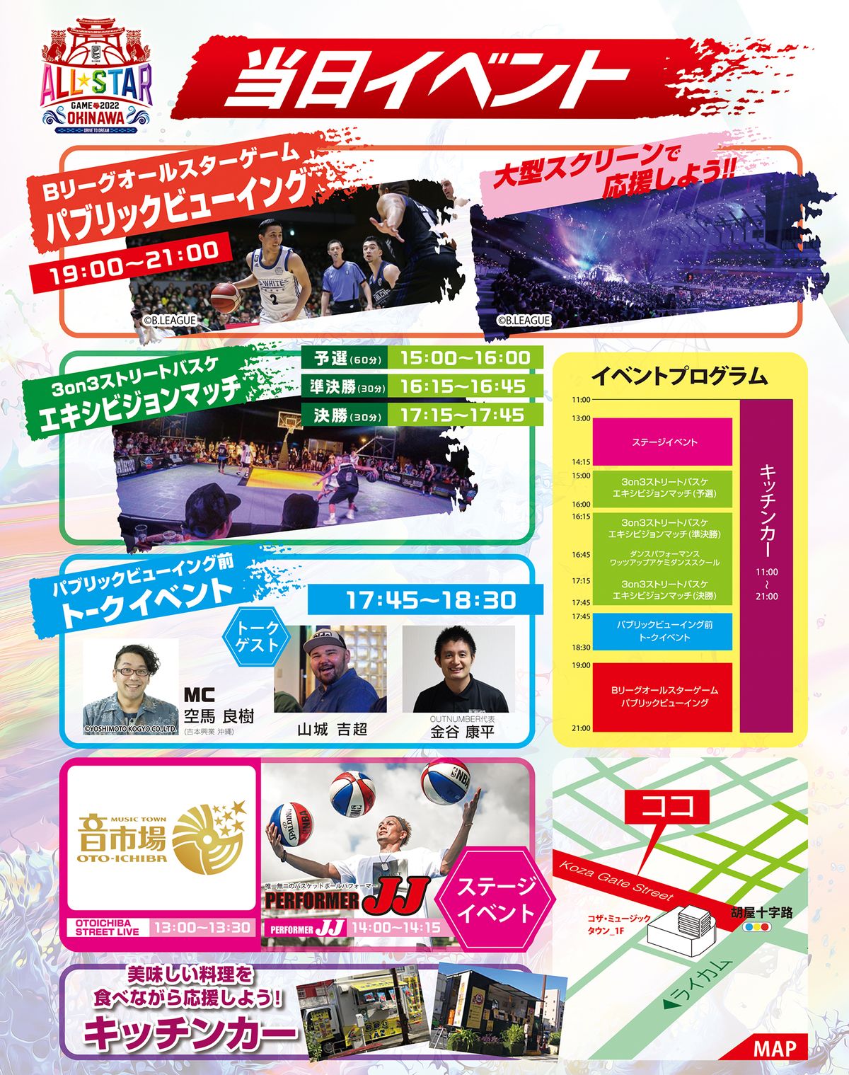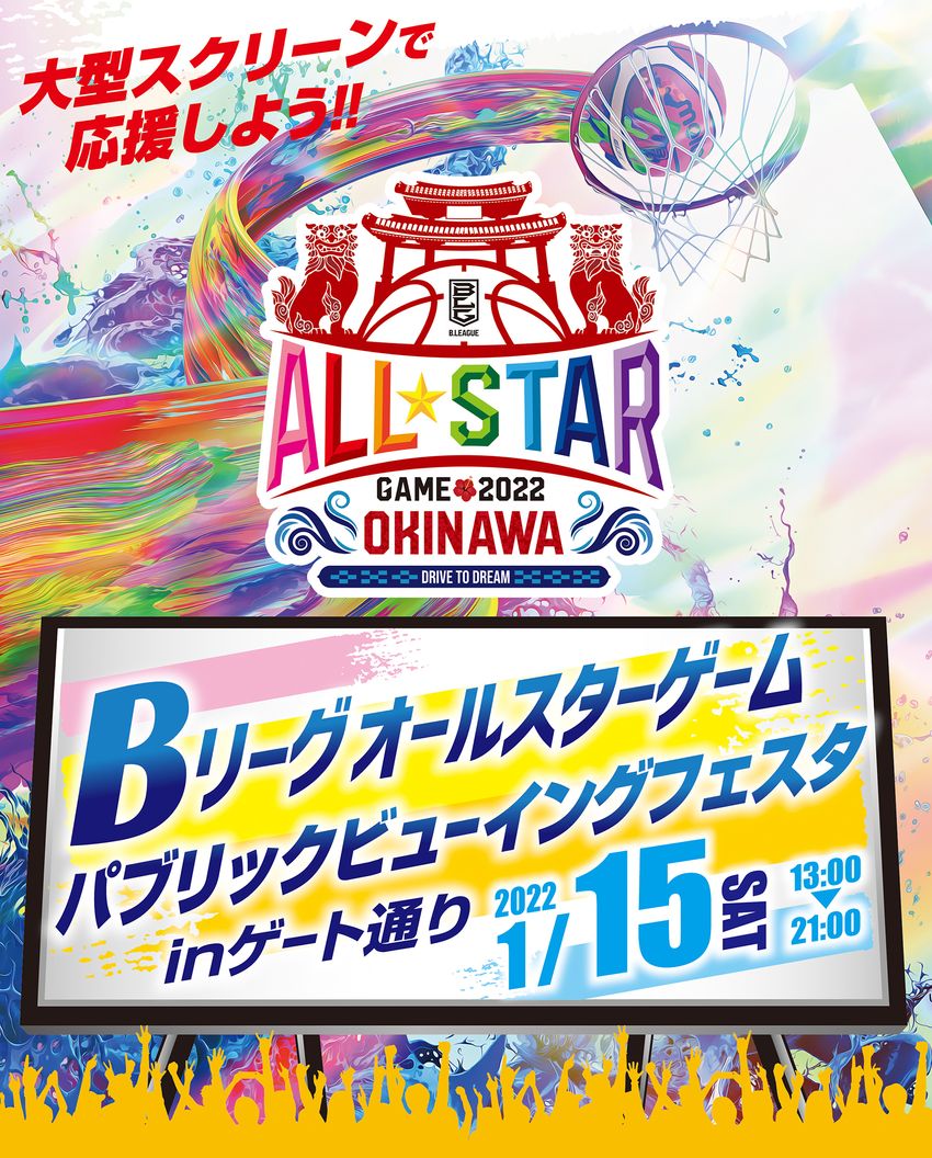 2021-22シーズンのオールスターは、1月15日(日)がメインとなるオールスターゲームの開催日。今春オープンした“夢のアリーナ”、沖縄アリーナを舞台とし、琉球ゴールデンキングスの岸本隆一、ジャック・クーリー、並里 成、また沖縄県沖縄市出身の山内盛久(三遠ネオフェニックス)と地元にゆかりのあるプレーヤーを含むスターが集まる華やかな祭典となる。ゲート通りでのパブリックビューイングフェスタは、このビッグイベントを幅約9mの大型スクリーンで楽しむことができ、沖縄グルメを提供するキッチンカーのサービスや元キングスの山城吉超氏らが登場するトークショー、3on3(3人制バスケ)のエキジビション、沖縄市のまち散策を楽しめるスタンプラリーなど楽しい催しが目白押しだ。