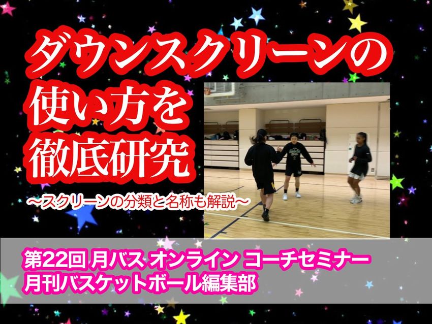 第22回は1月31日(月)20:00~ZOOMミーティングによるオンラインセミナーを開催する。ダウンスクリーンの使い方を徹底研究することをテーマに、ディフェンスの状況を見て4つのカットを使い分けることやポイト、練習方法などについて月刊バスケットボール編集部が細かく解説していきます。