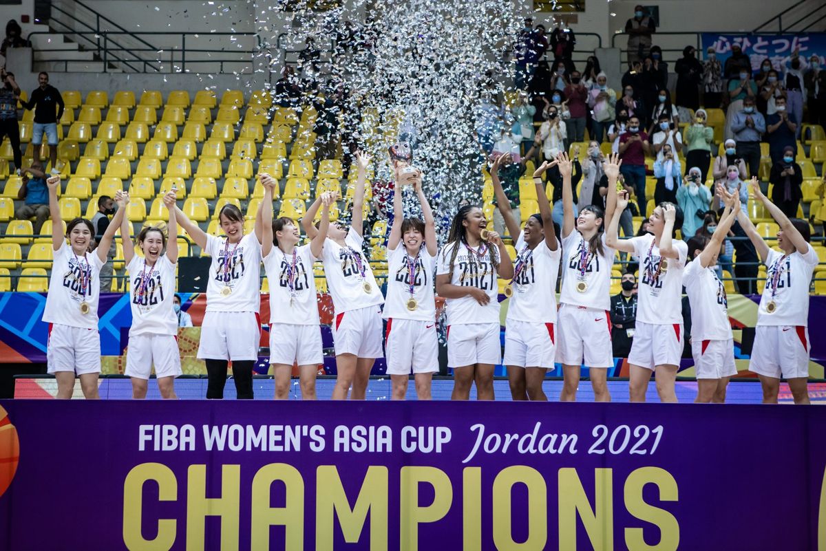 昨秋のFIBA女子アジアカップ2021で優勝し、表彰式で喜びを爆発させた日本代表(写真/c fiba.basketball)