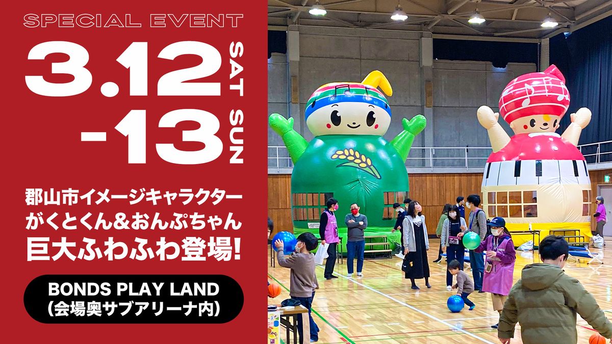 なお、『BONDS UP DAY 〜presented by 識学〜』の両日には、3月12日(土)にパンダラジオ、翌13日(日)には大黒摩季が出演し、会場を盛り上げる。またBONDS PLAY LAND(会場奥サブアリーナ)には、郡山市のイメージキャラクターのがくとくん&おんぷちゃんの巨大ふわふわが登場する(内容は変更になる可能性もある)。
