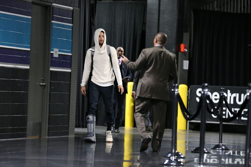12月4日のペリカンズ戦で5本の3Pシュートを沈め、通算3Pシュート成功数を2,000本の大台に乗せたステフィン・カリー(ウォリアーズ)。しかし、この試合で右足を痛めてしまったため、その後の試合は欠場。   写真は、12月9日に行われたピストンズ戦のため会場に入ってきたところのカリー。右足にプロテクターをしているが、復帰時期は未定という情報もあり、心配だ。   写真=石塚康隆 (月刊バスケットボール)