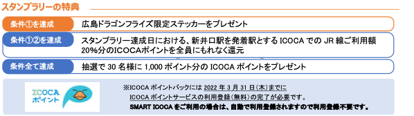 スタンプラリー参加者が条件をクリアした場合、ドラゴンフライズ限定ステッカーをゲットできる(下図参照)。また、会場の広島サンプラザホールからほど近いJR新井口駅までの鉄道利用金額の20%に相当するICOCAポイント還元を受けられ、さらに抽選で30人に1,000 ICOCAポイントが当たる。