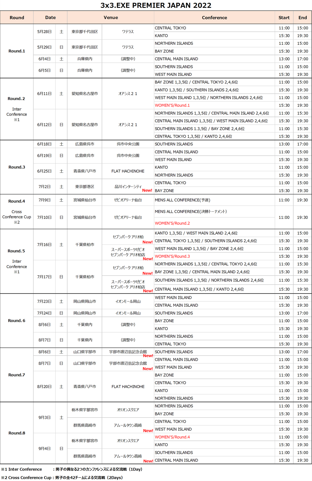 3人制バスケットボールのグローバルリーグ、3x3.EXE PREMIERの日本における2022シーズンのスケジュールが発表となった。今シーズンは男子が42チーム(7カンファレンス)で8ラウンド、女子は6チーム(1カンファレンス)4ラウンドを、全国13都市14会場で行う形になっている。日程は以下のとおりだ。