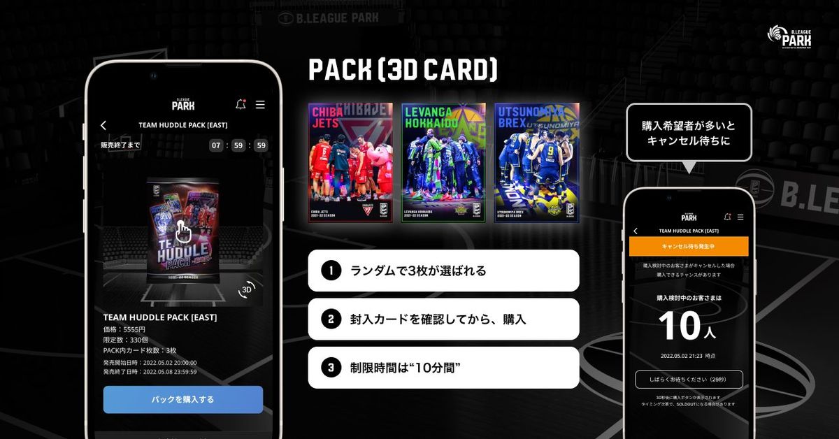 B.LEAGUE PARKはBリーグ公式NFTサービス第1弾として5月2日20時より、NFTカード3枚入りパックの販売を開始する。発売となるアイテムは「TIP OFF PACK(990円、限定1,540パック)」と、「TEAM HUDDLE PACK [EAST](5,555円、限定330パック)」の2種。さらに第2弾として5月9日(月)20時から「TEAM HUDDLE PACK [WEST]」の販売も予定されている。いずれも期間限定販売の貴重なNFTカードだ。