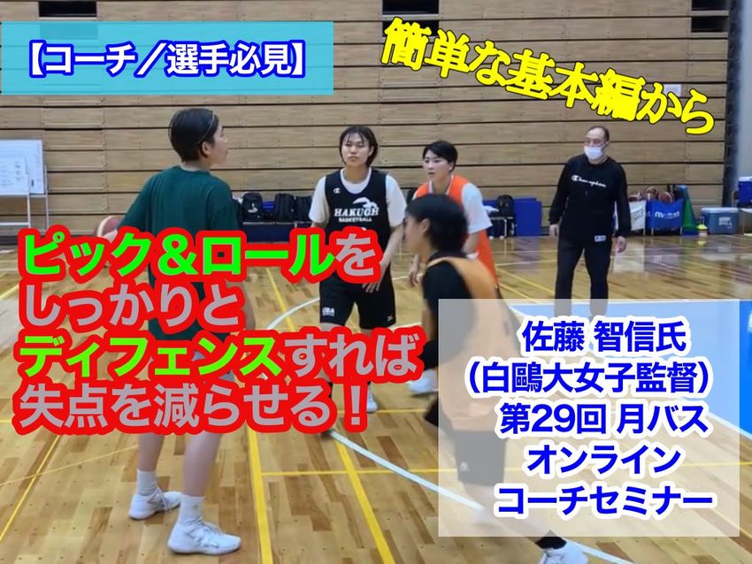 第29回は5月15日(日)20:00~ZOOMミーィングによるオンラインセミナーを開催する。テーマは、佐藤 智信氏(白鷗大女子監督)による「ピック&ロール ディフェンス」。簡単な基本編から応用編、練習までを解説していきます。オフェンスでは必ず出現するピック&ロールをしっかりディフェンスして、失点を減らしましょう。セミナーはコーチだけでなく、プレーヤーも必見の内容です。