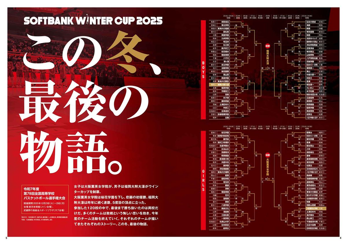 男子は福岡大附大濠が、女子は大阪薫英女学院がウインターカップを制覇。福岡大附大濠は昨年に続く連覇を達成し5度目の頂点。大阪薫英女学院は桜花学園を下し、悲願の初優勝を飾った。参加した120校の中で、最後まで勝ち抜いたのは両校だけだ。多くのチームは敗戦という悔しい思いを抱き、今年度のチーム活動を終えていく。それぞれのチームが描いてきたそれぞれのストーリー。この冬、最後の物語。
